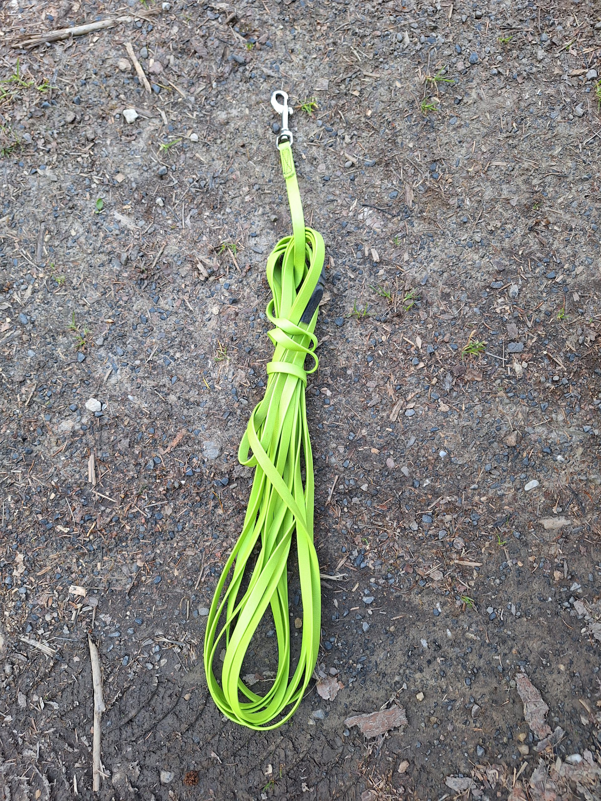 Noch ein wichtiger Tipp zum Schluss: Auch Materialpflege ist für die Langlebigkeit absolut empfehlenswert! Zudem hilft es, wenn die Schleppleine (insbesondere, wenn sie aus Kunststoff und ähnlichem Material besteht) nicht einfach irgendwie verknotet rumliegt. Ein vernünftiges Aufwickeln, am besten hängend gelagert, beugt zudem Mikrorisse im Material vor, spart im Endeffekt Zeit und hilft, dass euer Hundetrainer / eure Hundetrainerin keine (innere) Schnappatmung bekommt, wenn ihr eure Schleppleine auspackt.